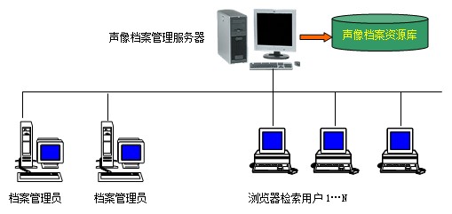 档案局、馆的声像资料一般实行集中式管理,因此,该系统设置几个档案管理员,管理员安装C/S模块的程序,对声像档案资源库中的信息进行全方位的管理,普通用户不用安装任何程序,通过浏览器检索、浏览、下载需要的声像档案资源。