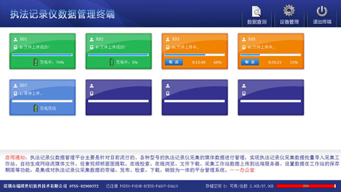 9、满足公安部最新关于执法仪后台软件的标准。支持公安部GA/T 947.4-2015标准,支持读取、修改设备号、警号,同步执法仪时间,当执法仪接入时自动读取执法仪数据,读取成功的数据自动从执法仪中删除,数据读取完成,自动对执法仪进行充电。采集工作站支持的USB端口数没有上限限制,可以任意定制。